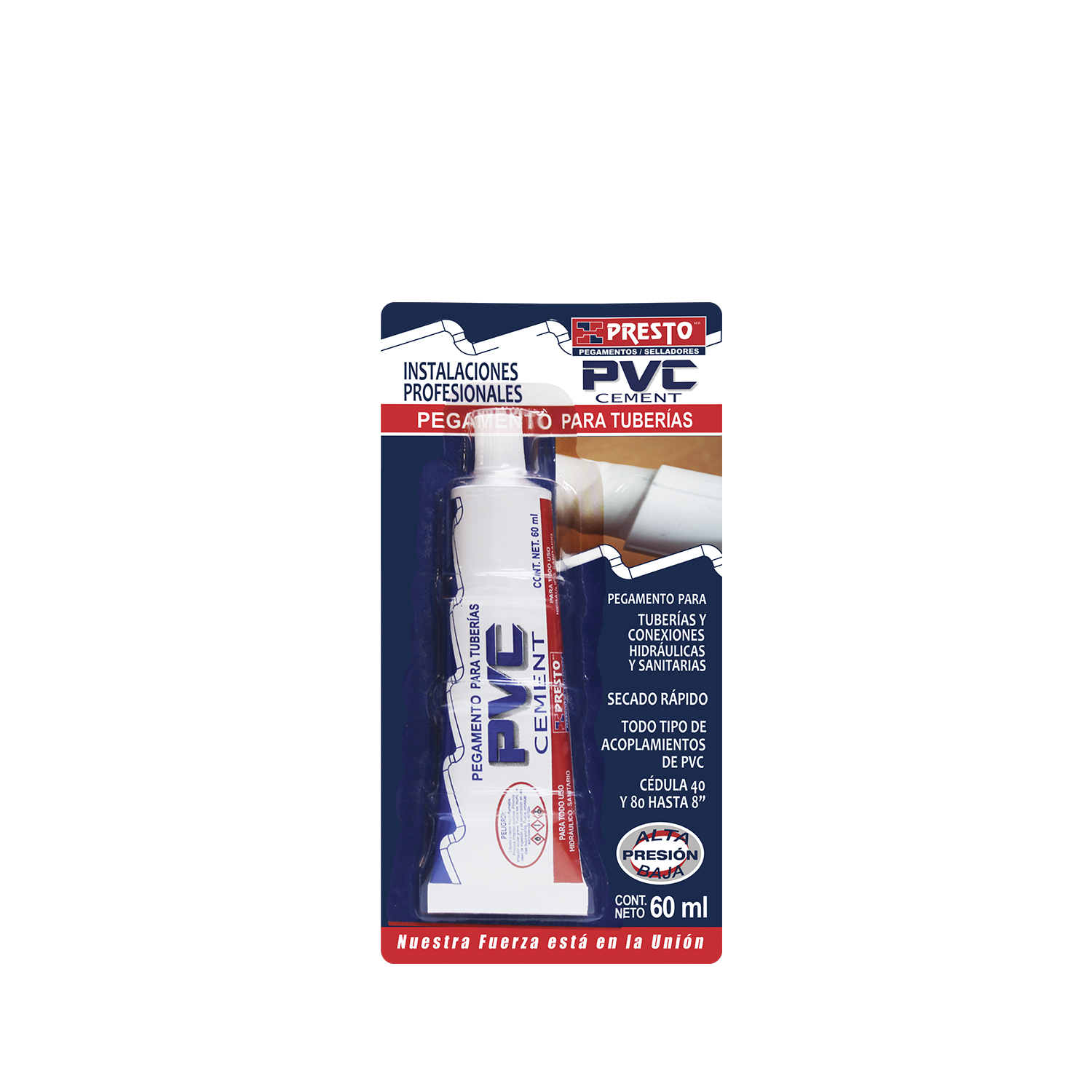 Extraordinario pegamento especialmente formulado para la unión permanente de: tuberías, conexiones, todo tipo de acoplamientos de PVC rígido, calibrados y no calibrados, alta y baja presión cédula 40 y 80 hasta 8”, de secado rápido.