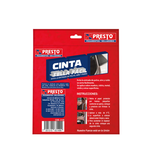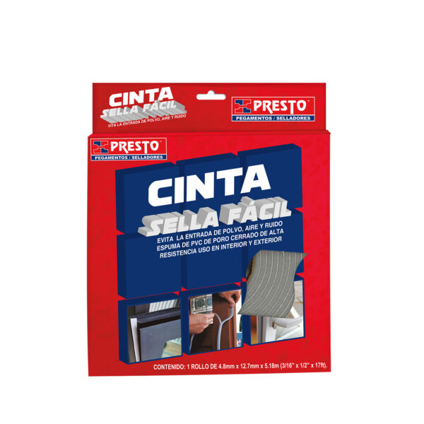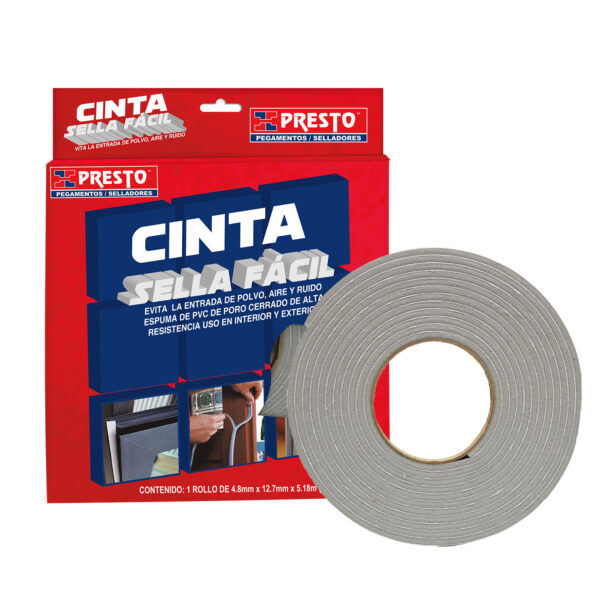 Cinta de PVC de poro cerrado de alta resistencia para interior y exterior. Evita la entrada de polvo, aire y ruido. Resistente a la intemperie, oxidación, hongos y rayos UV. Resiste temperaturas de -40°C hasta 80°C. Tiene baja absorción de agua (menos del 1%). Se aplica sobre madera, vidrio, metal, vinilo y otras superficies.