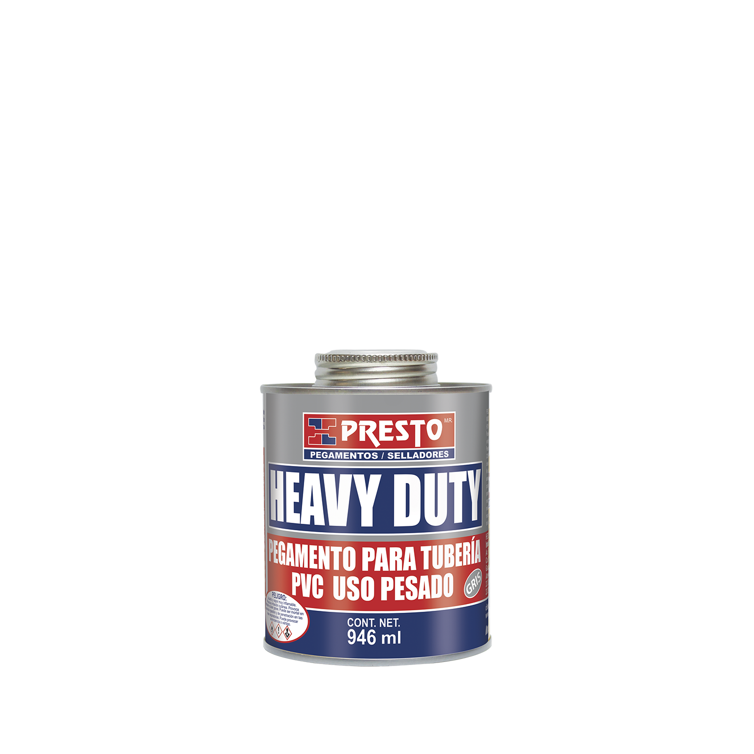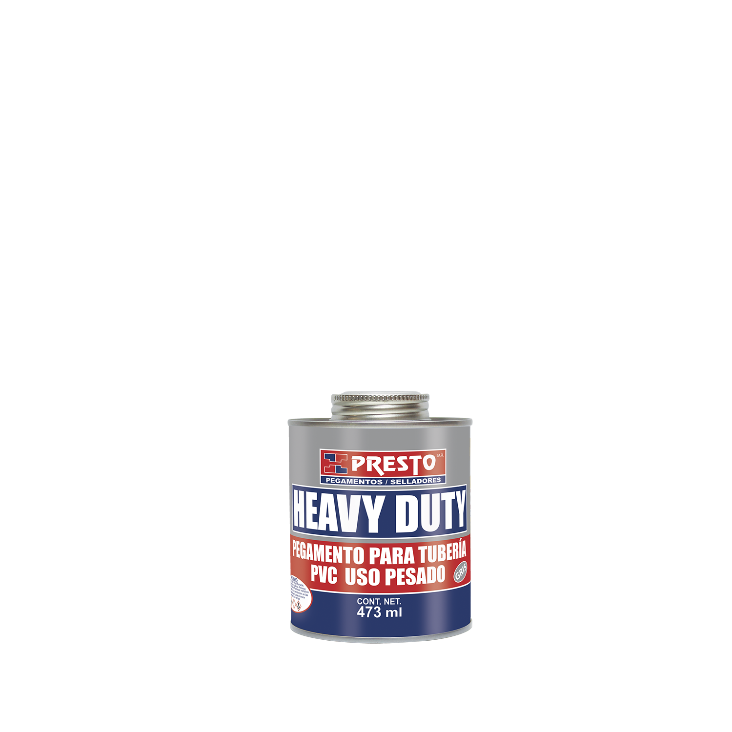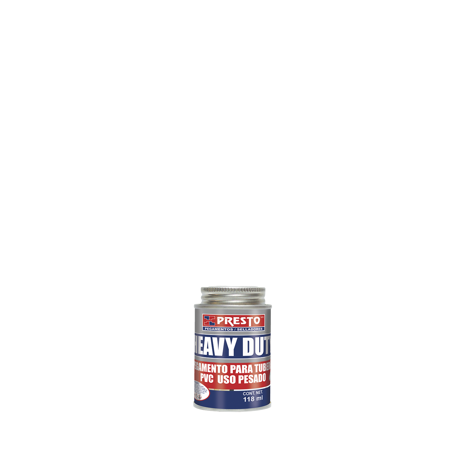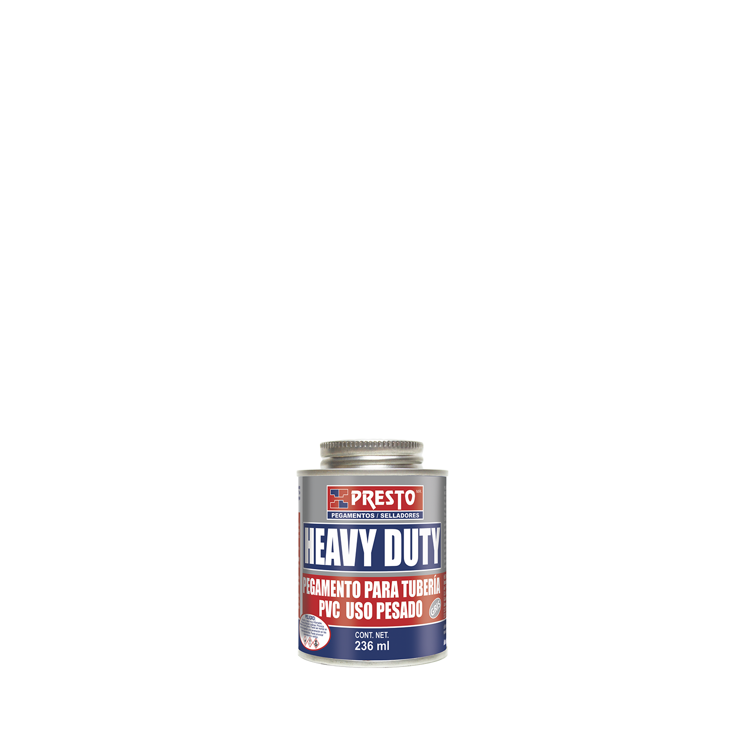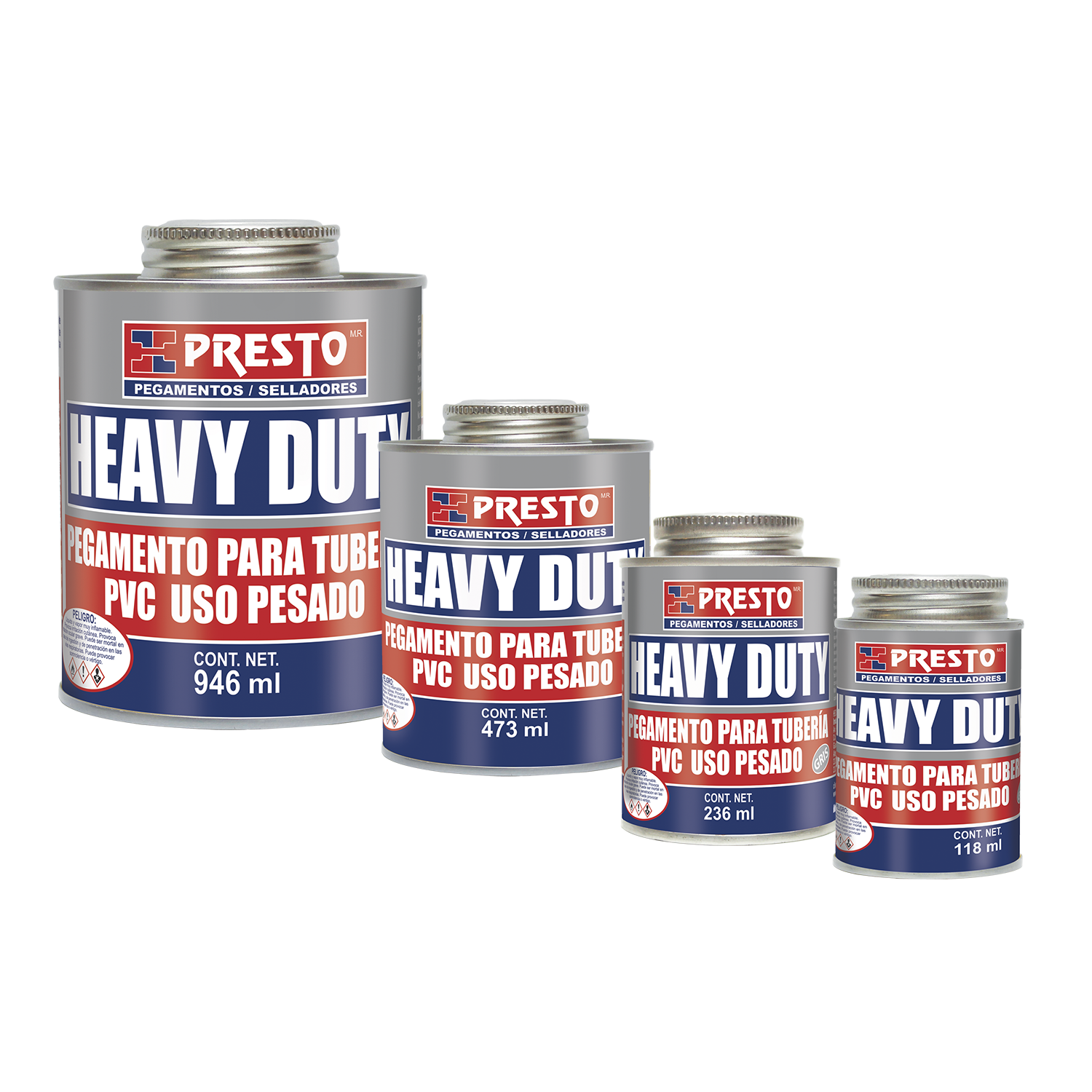El pegamento PVC PRESTO HEAVY DUTY es un producto especialmente formulado para la unión permanente de tuberías y conexiones de PVC hasta de 12” de diámetro y cédula 40 y 80.
